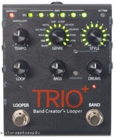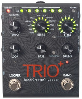 The TRIO+ is a simple-to-use guitar pedal that listens to the way you play and automatically generates bass and drum parts that match your song. Just plug your guitar into the TRIO+, press the Band footswitch to teach the TRIO+ your chords and rhythm, then press the Band footswitch again to start playing with your own personal band! Bass and drum levels can be adjusted for the perfect mix using the TRIO+'s Bass and Drums knobs. The TRIO+ also features a Simple Bass button lets you select between 3 bass line modes for busy or simple bass lines. Pushing the Band Creator™ paradigm further, the TRIO+ also allows you to loop and custom sequence your looped guitar parts to create full songs on the fly. Press the TRIO+'s Looper footswitch to record a loop along with an unlimited number of overdubs. The Loop level can be individually controlled using the TRIO+'s Loop knob. Loops can be recorded by themselves, operating just like a traditional looper, or along with the band. You can also apply built-in effects to your guitar signal by enabling the TRIO+'s Guitar FX button, or connect your favorite effects to the TRIO+'s FX Send and FX Return jacks. The TRIO+ provides 12 music genres to choose from including Blues, R&B, Rock, Alternative Rock, Metal, Pop, Electronic Pop, Hip-Hop, Country, Folk, Latin, and Jazz. 12 song styles are available for each genre and can be selected using the TRIO+'s Style encoder, including selection between 3/4 and 4/4 time signatures. Multi-colored LEDs around the TRIO+'s Style encoder indicate which styles best match your song. The TRIO+ can learn up to 5 different song parts, perfect for creating an intro, verse, chorus, bridge and outro. Song parts can be recalled on-the-fly as the song plays back or pre-programmed as a sequence for automated playback. An optional DigiTech FS3X Footswitch can be connected to the TRIO+'s Control In jack for additional handsfree control with 3 modes of operation to select from. Up to 12 songs along with loops can be stored to the TRIO+'s Micro SD Card (included). Need to create more songs? No problem. Just insert a new SD Card and you're ready to start teaching the band your new songs. To manage all your songs and loops on a computer, download the free Librarian Manager software from digitech.com, available for Windows® and Mac®. The TRIO+ offers independent Tempo, Genre, Style, Loop Level, Bass Level, Drums Level, Headphone Output Level controls; Guitar, FX Return and Control Inputs; Amplifier, Mixer, FX Send and Headphone Outputs; Built-in Guitar Effects (relative to music genre); a Soft Click Footswitch and includes a 9V DC adapter