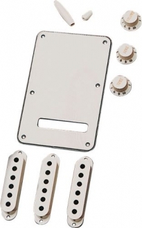 Change the look of your Stratocaster easily and affordably with a Stratocaster Accessory Kit. Contains volume and tone control knobs, pickup switch tip and tremolo arm tip, tremolo backplate and pickup covers (pickup covers do not fit SCN™, N3™ and Noiseless™ pickups).