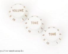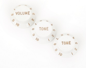 White (Volume, Tone, Tone) (3) Set of three plastic push-on control knobs designed to fit 1/4" split-shaft potentiometers on nearly all U.S.- and Mexico-made Stratocaster models manufactured from 1954-present.