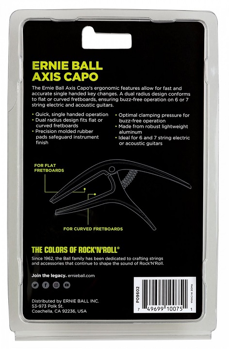 The Ernie Ball Axis Capo’s ergonomic features allow for fast and accurate single-handed key changes. Compatible with most electric and acoustic guitars, the Axis capo offers eight color finishes to match, with a dual-radius design that fits both flat and curved fretboards. Shift capo position single-handedly, and rely on buzz-free clamping pressure that lets your songs sing out in every key. Take the Axis Capo on the road and trust precision-molded rubber pads to protect your guitar finish. On the stage or in your writing space, it has to be the Axis Capo