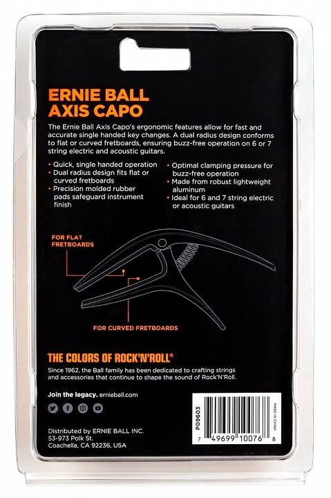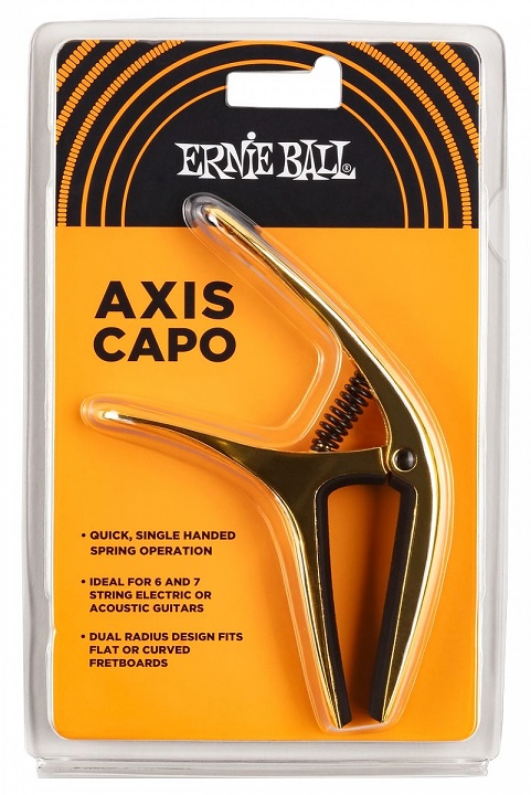 The Ernie Ball Axis Capo’s ergonomic features allow for fast and accurate single-handed key changes. Compatible with most electric and acoustic guitars, the Axis capo offers eight color finishes to match, with a dual-radius design that fits both flat and curved fretboards. Shift capo position single-handedly, and rely on buzz-free clamping pressure that lets your songs sing out in every key. Take the Axis Capo on the road and trust precision-molded rubber pads to protect your guitar finish. On the stage or in your writing space, it has to be the Axis Capo