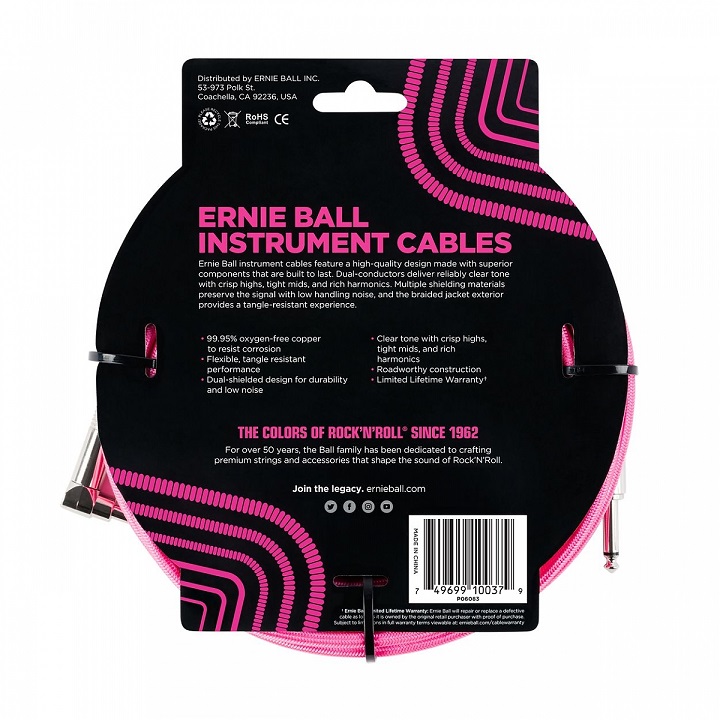 Ernie Ball instrument cables feature a high-quality design made with superior components that are built to last. Dual-conductors deliver reliably clear tone with crisp highs, tight mids, and rich harmonics. Multiple shielding materials preserve the signal with low handling noise, and the braided jacket exterior provides a tangle-resistant experience. Cable length 18ft (5.49m)
