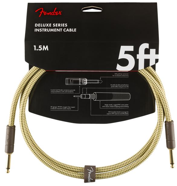 - Fender Deluxe Series cables carry the highest quality materials and braided shielding to deliver flagship durability, conductance and transparency. Our top-of-the-line cables sport custom molded ends with strain relief under the housing—plus 24K gold-plated connectors that won’t tarnish or degrade your sound over time. These cables use a very quiet braided shielding that is engineered to maximize the purity of your tone, and they’re protected by a soft-woven yet rugged tweed jacket that provides ultimate protection with classic Fender style.