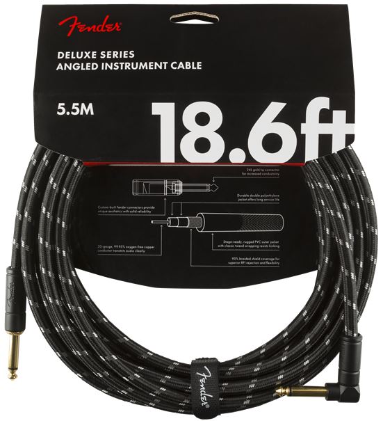 Deluxe Series Instrument Cable, Straight/Angle, 18.6', Black Tweed Fender Deluxe Series cables carry the highest quality materials and braided shielding to deliver flagship durability, conductance and transparency. Our top-of-the-line cables sport custom molded ends with strain relief under the housing—plus 24K gold-plated connectors that won’t tarnish or degrade your sound over time. These cables use a very quiet braided shielding that is engineered to maximize the purity of your tone, and they’re protected by a soft-woven yet rugged tweed jacket that provides ultimate protection with classic Fender style.