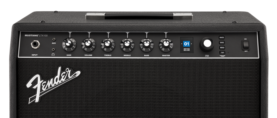 - Ovládání: Gain, Volume, Treble, Middle, Bass, Master, Preset Select, Back Button, Save Button, Menu Button, Tap Tempo/Tuner Button