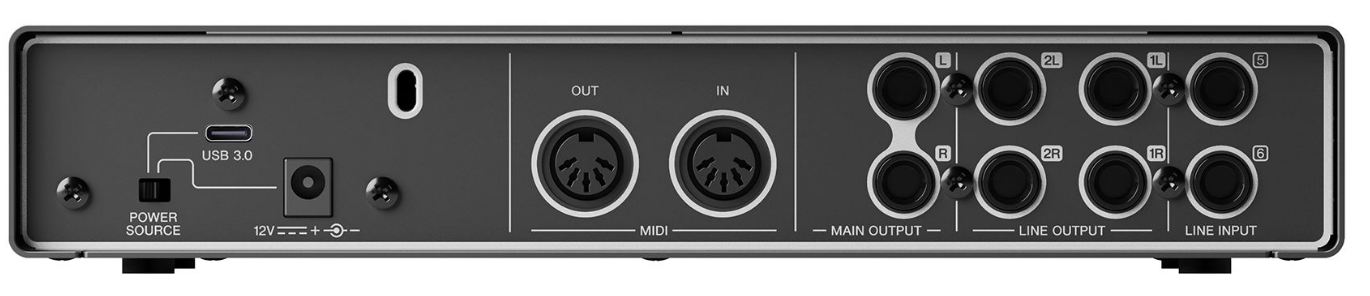 - Analogové vstupy: 4× combo (2× Mic/Hi-Z, 2× Mic/Line) + 2× TRS