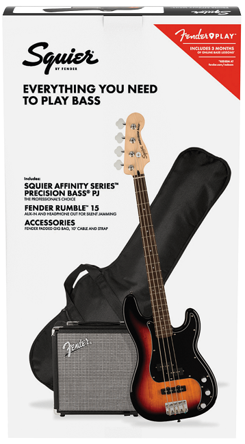 - Delivering 15 watts of pure Fender bass tone, the Rumble 15 amplifier features an 8" Fender Special Design speaker, three-band EQ, headphone jack for silent practice and an aux input jack for connecting a media device. With the included padded gig bag, strap and 10' cable, the Squier Affinity Precision Bass PJ Pack has everything you need to turn your affinity for music into a lifelong passion
